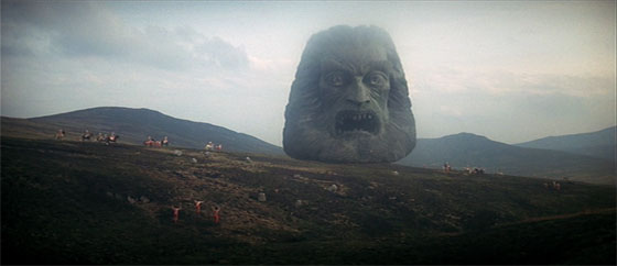 Uno de los mayores aciertos de Zardoz es la cabeza de piedra gigante que sobrevuela las Tierras Exteriores y es reverenciada por la facción más violenta de los Brutales, una caterva de asesinos que extermina a sus congéneres al grito de: «Pistolas sí, penes no».